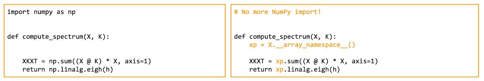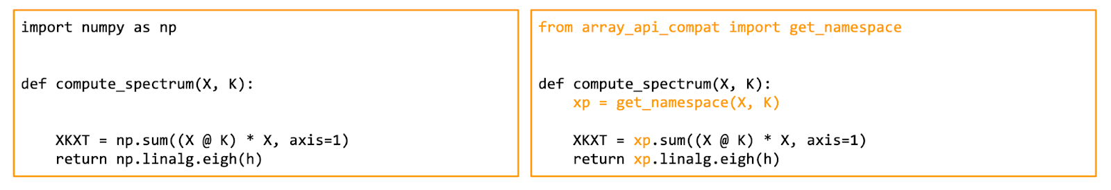 Before, the code would explicitly import NumPy (as “np”) perform linear algebra operations on NumPy arrays passed as input to the scikit-learn functions. Now, compliant functions accept any array API-compliant input without any explicit hard dependencies on those libraries: the underlying module is retrieved (as “xp”) by inspecting the input arguments. Subsequent linear algebra operations are therefore delegate to input-specific libraries without having to couple the source code explicitly to any of those array libraries.